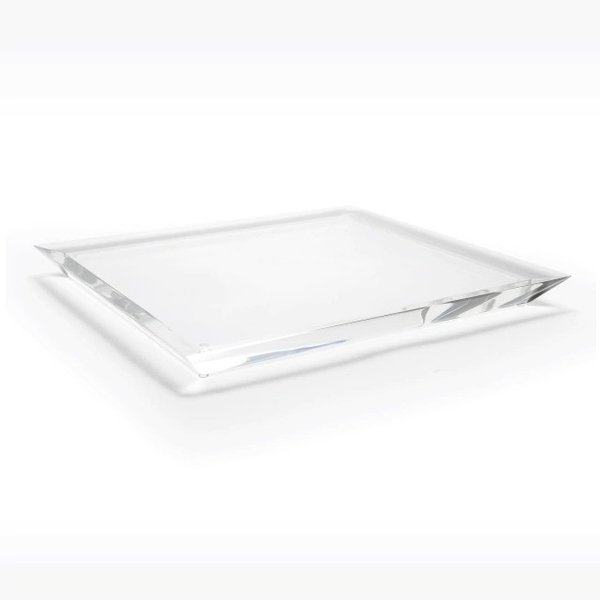 Feita em acrílico transparente maciço de 25 mm, seu acabamento diamantado nas bordas reflete a luz com delicadeza, criando um efeito visual sofisticado. Com formato amplo e proporções generosas, é perfeita para servir bebidas, organizar acessórios ou valorizar ambientes como aparadores, bares e espaços gourmet.