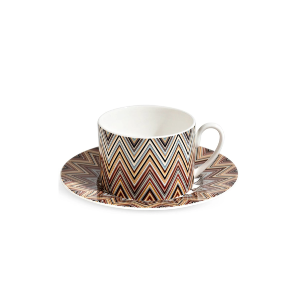 Produzido em porcelana premium, apresenta o icônico padrão chevron da Missoni em uma paleta off white com detalhes multicoloridos, traduzindo leveza e sofisticação em cada traço.