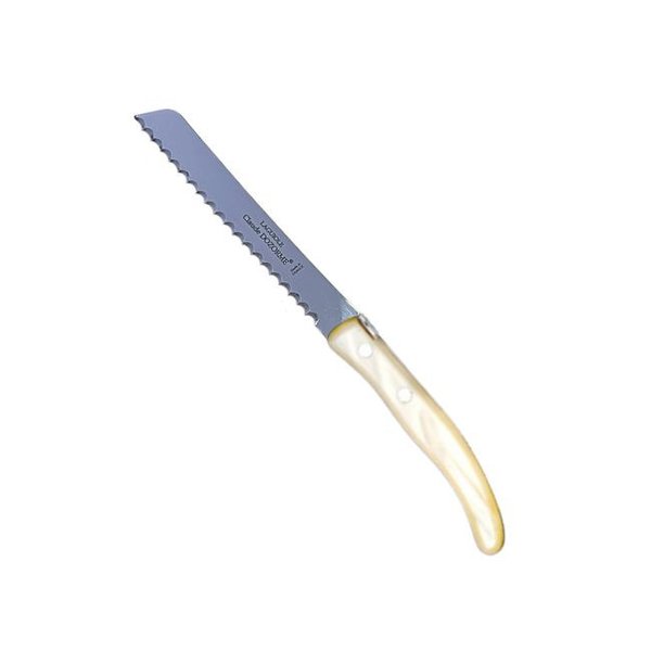 Produzido na França pela renomada Laguiole (Claude Dozorme), o fatiador combina lâmina em aço inox de alta qualidade com cabo em resina perolada natural, oferecendo equilíbrio, conforto no manuseio e um visual sofisticado.
