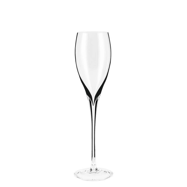 Feita em cristal de alta qualidade, a peça possui haste longa para evitar a transferência de calor da mão à bebida, mantendo o espumante gelado por mais tempo. O bojo arredondado e a boca estreita direcionam o líquido diretamente ao fundo da taça, sem escorrer pelas laterais, o que preserva o frescor e o aroma com precisão.