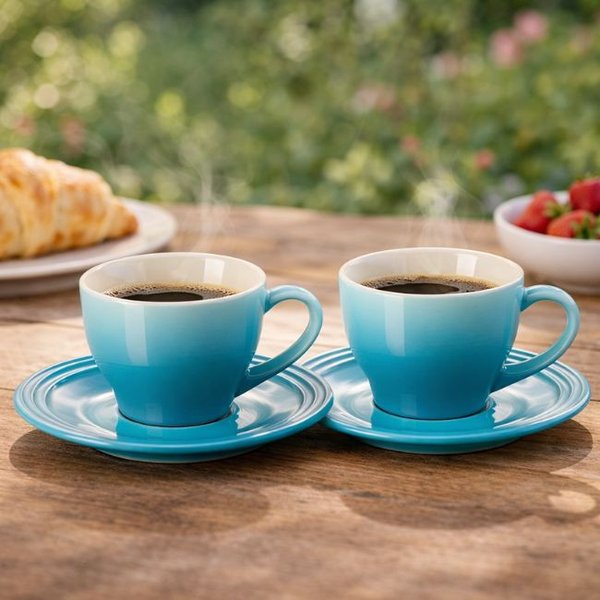 Com acabamento esmaltado e cores vibrantes da Le Creuset, a superfície é resistente a manchas, fácil de limpar e pode ir ao micro-ondas, congelador e lava-louças. O design com pires traz um toque extra de elegância e funcionalidade para cafés da manhã, sobremesas ou ocasiões especiais.