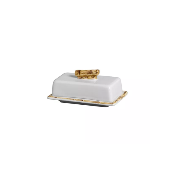Produzida em cerâmica feldspática de alta resistência, preserva o frescor da manteiga e adiciona um toque rústico e sofisticado à mesa posta, graças ao acabamento que reproduz a textura do bambu.