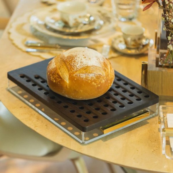 Ideal para servir e cortar pães com praticidade, sua base com aberturas armazena as migalhas discretamente, mantendo a toalha de mesa limpa e o ambiente sempre organizado com sofisticação.