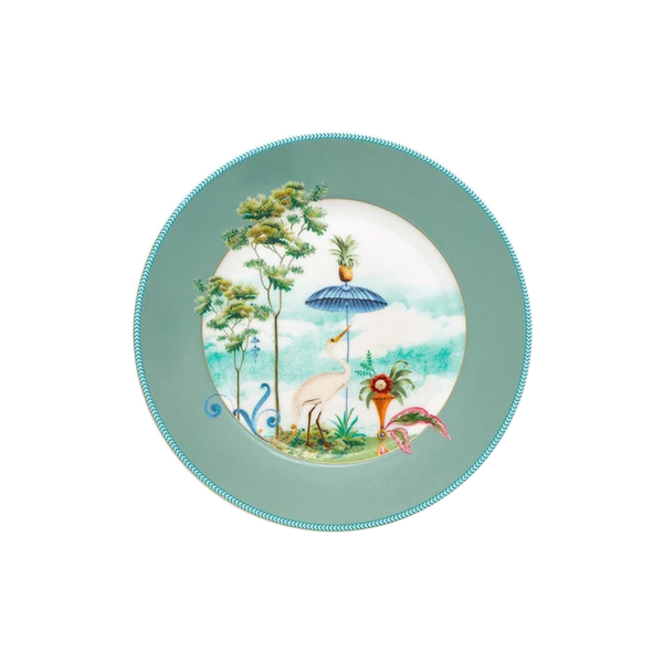 O encanto das ilhas tropicais à mesa. Com fundo azul e um delicado desenho de garça entre flores e folhagens exóticas, o prato de sobremesa da coleção Jolie transmite leveza e sofisticação. Ideal para servir doces com charme e transformar qualquer momento em celebração.