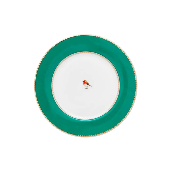 O charme da sobremesa em um design clássico e encantador. Este prato da coleção Love Birds é decorado com borda verde e fios de ouro, trazendo no centro um vibrante Tordo que completa a composição com elegância. Uma peça que transforma até os momentos mais simples à mesa.