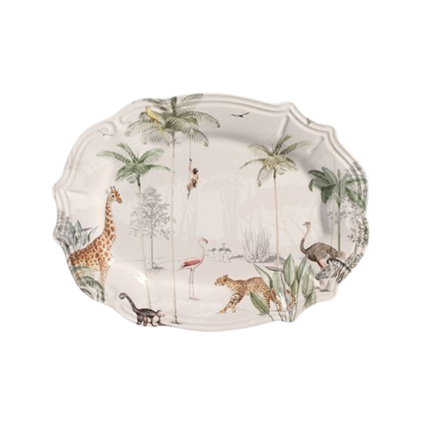 Inspirada na exuberância da natureza africana, a estampa Safari Toile traz uma releitura contemporânea do clássico toile de jouy francês, com ilustrações ricas em detalhes que transformam qualquer refeição em um verdadeiro espetáculo visual.