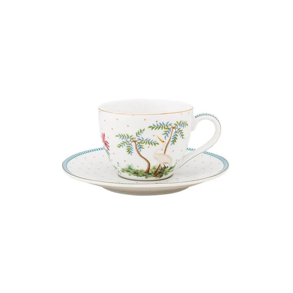 Delicada e festiva, esta xícara com pires da coleção Jolie traz um charme tropical à sua mesa. Os pontos dourados e os detalhes em azul na alça e bordas valorizam o design encantador. O pires complementa com flores tropicais e um acabamento refinado. Ideal para um expresso simples ou duplo.